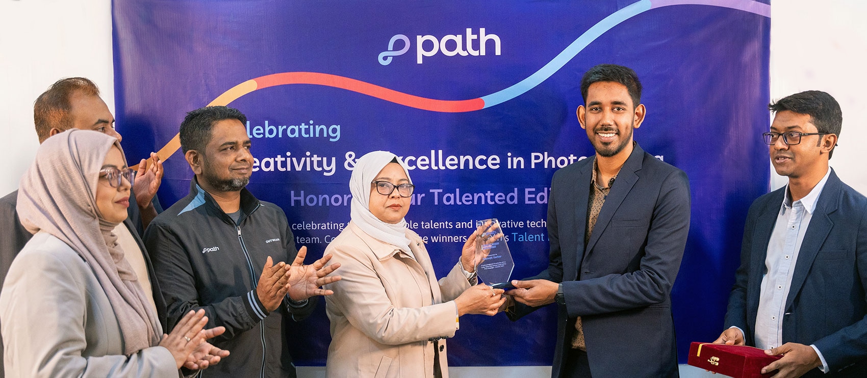 A laptop displaying the Path website homepage with the text “Path is your virtual photo editing studio,” overlaid with colorful graphic accents.