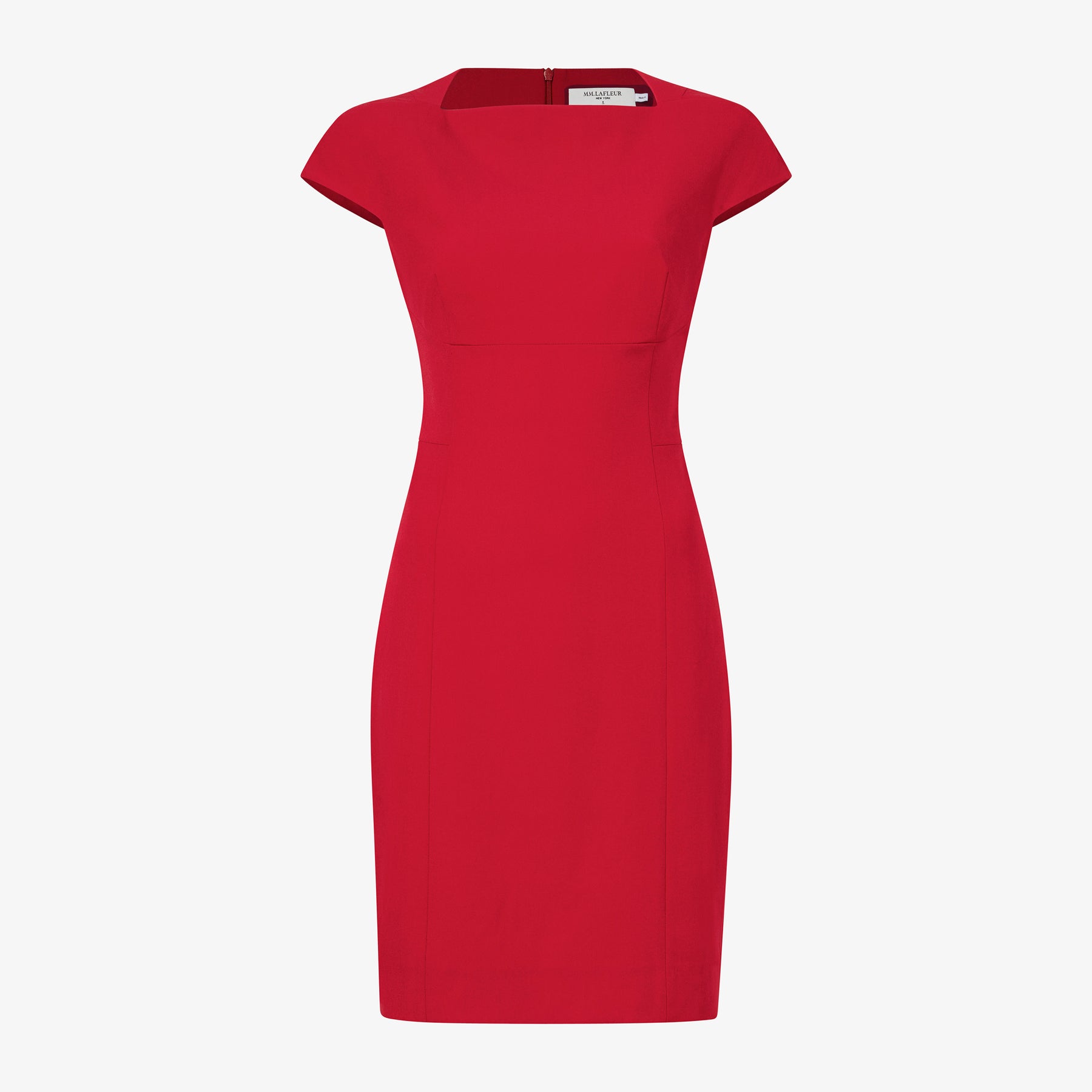 Red dress with zoomed-in detail on label area, showcasing brand and fabric quality.